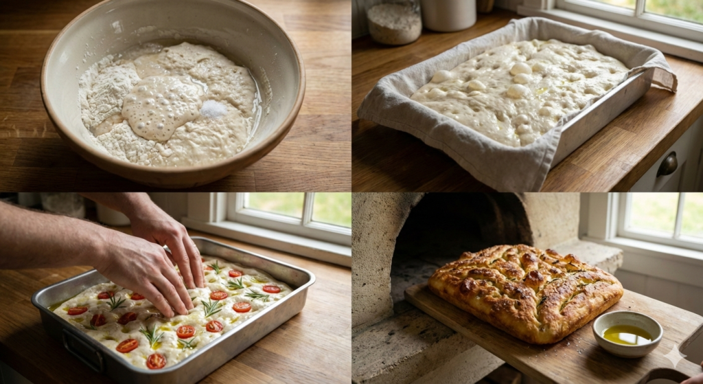• Uma referência comum pra essa focaccia “fácil”: ~220°C e cerca de 25 min, até dourar.