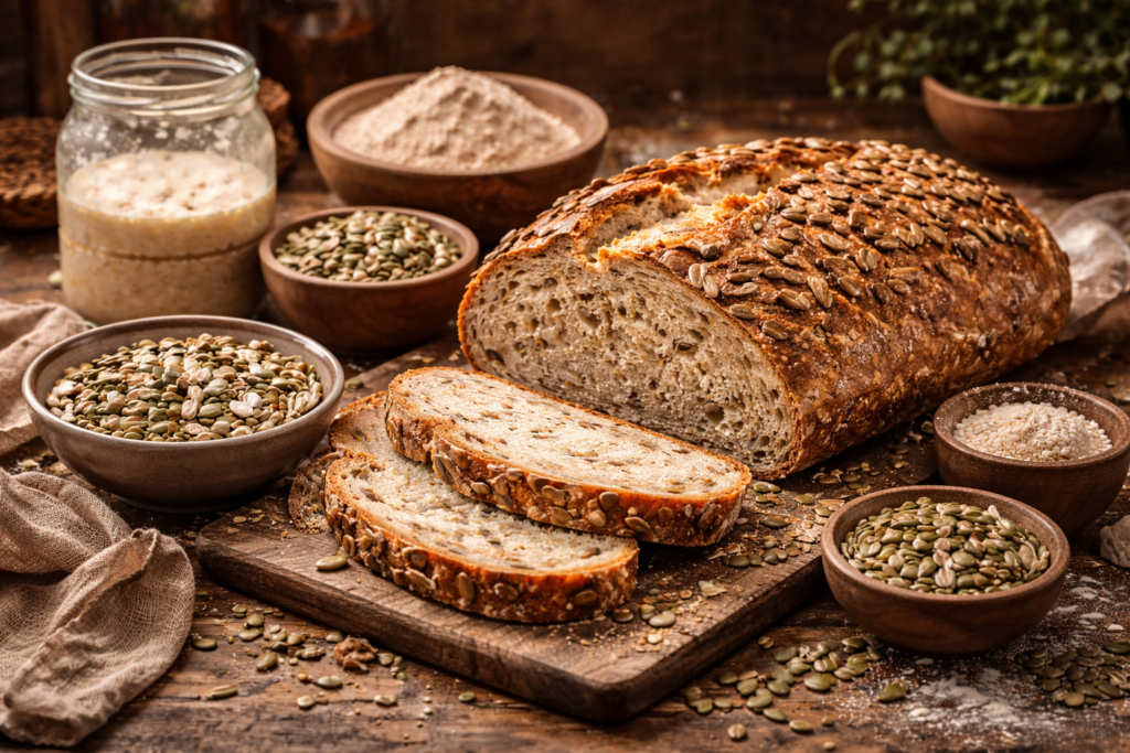 Fazer pão em casa não é apenas um hobby, é uma decisão de saúde. O fermento natural (Levain) é uma colônia viva de bactérias do bem e leveduras selvagens.